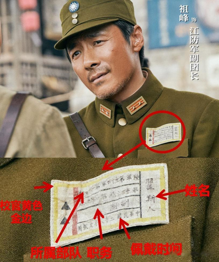 在军装上祖峰饰演的翟斯人副团长是陆军中校,此时正好是夏天所以他身穿的是中央军的黄绿色的军官呢子军装,其所属的江防团是步兵单位在兵科章上对应的则是红色标志,因为是中校对应的则是“2杠2星”,这一点完全正确。