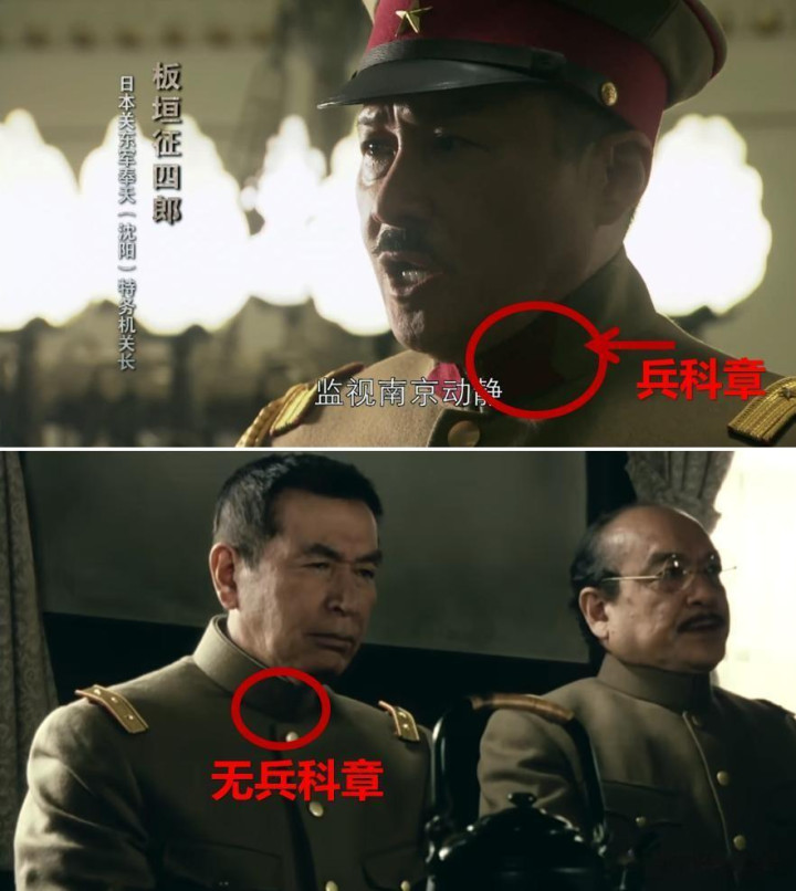 同样还有的就是日军昭和五军装领章乱挂,在日军的规定中少将以上将军并不隶属于任何一个兵种,因此他们是没有领章的,而在很多国产剧中他们依然是佩戴红色步兵的领章,建议编剧去看一下日本老电影《二二六》中的日军将军。